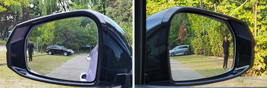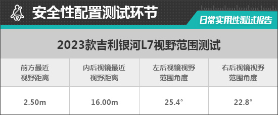 测试车辆的左/右外后视镜没有采用双曲率镜片,实测后,左外后视镜视野范围为25.4°,右外后视镜视野范围为22.8°,左右视野在测试过的同级别车型中均处于中上游水平。
