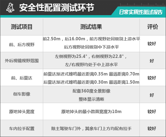 在车辆前、后方视野测试中,车内所有座椅均已调整至最低状态,所测出的数据与驾驶者正常使用时均有一些偏差,仅供参考。