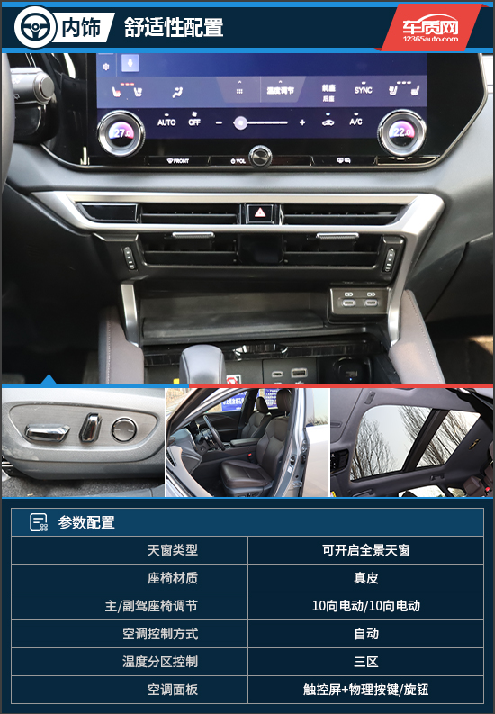 在舒适性方面,评测车配备了可开启全景天窗,并且开启面积足够大,这一点相较老款车型有一定提升。空调控制方面,其采用了触控屏+旋钮+按键的操作方式,在科技化的同时保留了一定的物理操控机构。