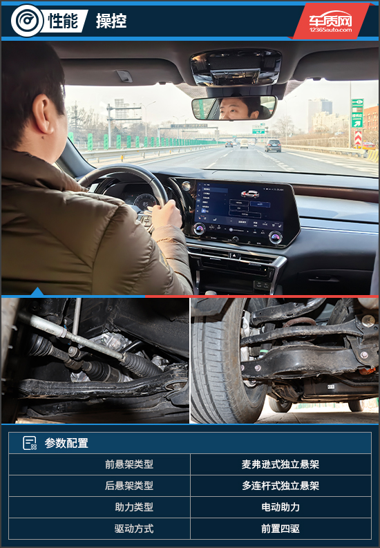 值得一提的是,评测车配备雷克萨斯DIRECT4电子动态四驱系统,其核心部件是位于后桥的eAxle电驱单元。该系统可以根据地面接触载荷来控制四个车轮的制动力,从而使车辆姿态符合驾驶员意图。当加速时,DIRECT4电子动态四驱系统可根据前后轮的地面接触载荷来分配加速所需的驱动力,从而稳定车辆和乘客的姿态,同理,减速时DIRECT4电子动态四驱系统也会调整四轮的制动力,从而减少车辆点头的现象。另外,在转弯时,DIRECT4电子动态四驱系统能根据地面的接触载荷来分配驱动力和制动力,从而更好地控制车身姿态。