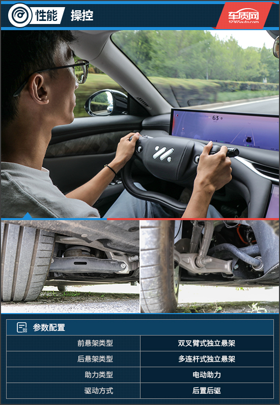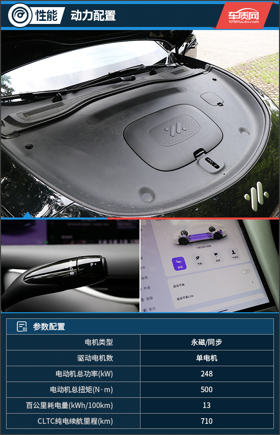 此次评测车搭载后置单电机,总功率248kW,总扭矩500N·m,传动系统为固定齿比变速箱。从参数上来看,动力储备十分充足,满足日常使用完全没有问题。同时,其还提供了“直线竞速”和“赛道竞速”等多种极限驾驶模式,并支持对动力进行细微调整,可见其运动化的定位。