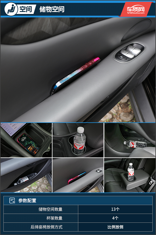 储物空间方面,储物格数量中规中矩。前排中央通道采用了悬浮式设计,上方提供了一个手机无线充电板和一个深度不错的储物槽。后方为两个杯架,均带有限位器。底部则是一个硕大的储物槽,可以放置挎包等体积较大的物品。此外,后排车门拉手与前排一样均采用了封底式设计,便于放置手机。