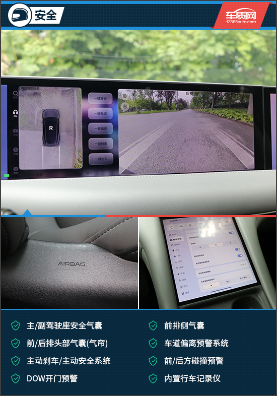 安全配置方面,评测车标配了丰富的主动安全和被动安全配置。值得一提的是,评测车还提供了后方视野显示功能,当拨动转向灯,屏幕中就会显示相应侧的侧后方实时影像,并可与“雨夜模式”联动,开启后左右侧实时影像会常驻在屏幕两侧,便于观察。