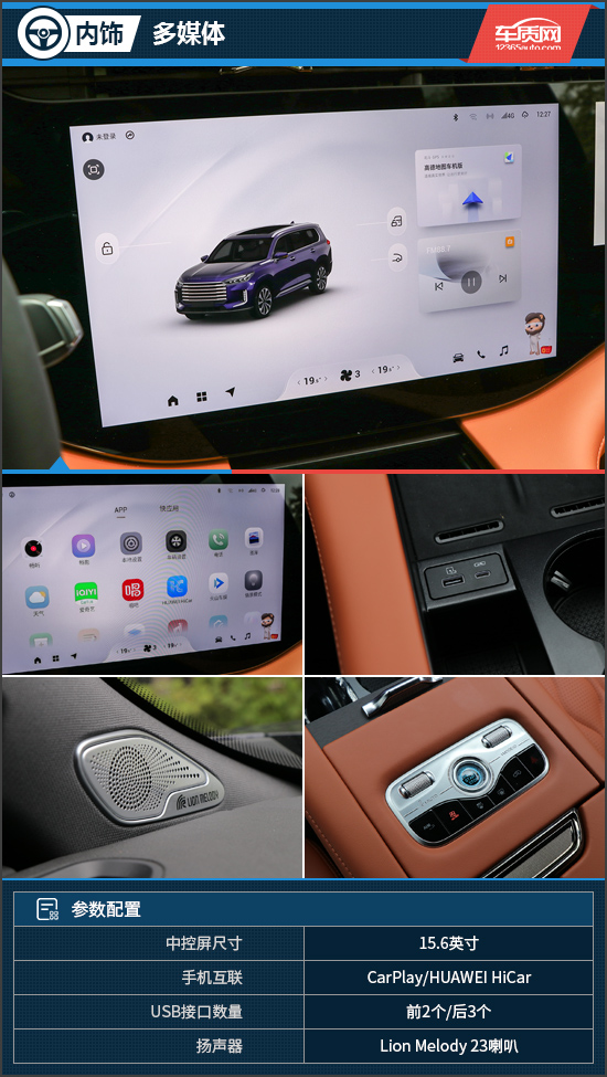 中控区域搭载了一块15.6英寸内嵌屏,车机内置主流的高通骁龙8155芯片,整体操作流畅度以及功能丰富程度都能令人满意。同时,车机还支持CarPlay和HUAWEI HiCar互联,提升了日常使用便利性。此外,评测车还配备23喇叭Lion Melody音响系统,能够带来出色的听觉享受。值得一提的是,星途揽月支持四音区语音交互功能,可针对766项功能实现“可见即可说”。