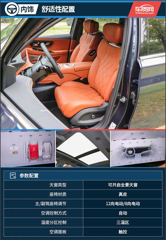 舒适性方面,诸如前排座椅加热、通风、按摩等使用频率较高的配置均有所配备。略有遗憾的是,虽然前排座椅视觉效果显得非常宽大,但柔软度稍欠“火候”。此外,评测车还提供了可开启全景天窗、三温区空调等配置,舒适性表现比较不错。