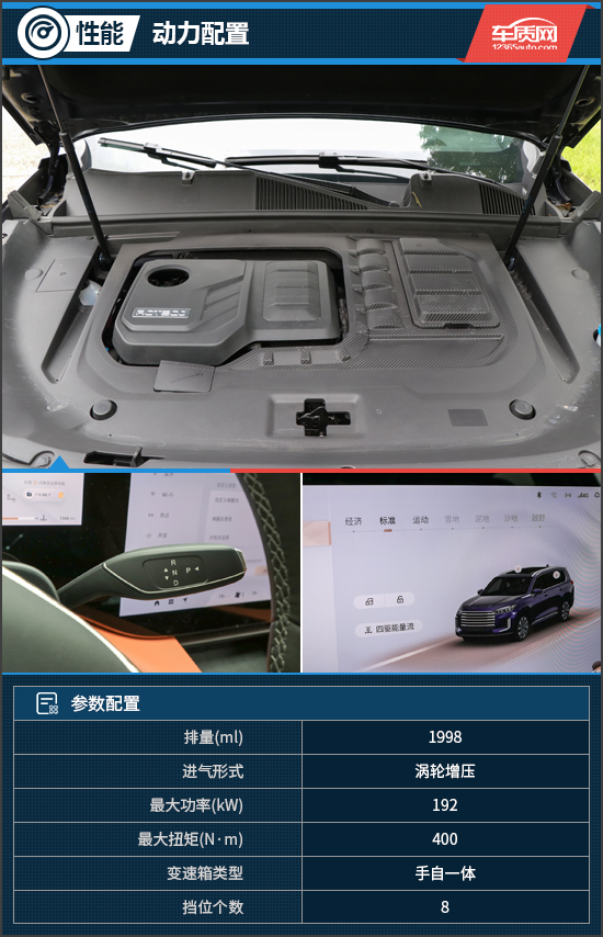 动力方面,2025款星途揽月全系搭载一台2.0T涡轮增压发动机,最大功率192kW,最大扭矩400N·m,与之匹配的是爱信8挡手自一体变速箱。同时,评测车还配备了博格华纳第六代四驱系统,可根据路况和驾驶需求智能分配前后轮的动力输出,提高车辆的通过性和稳定性。