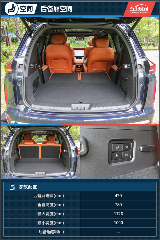 后备厢整体表现出色,地台十分平整,第三排座椅支持比例放倒,能够容纳较多物品。此外,后备厢的左侧还设置了第三排座椅放倒/直立电动调节按键,档次感和便利性均有所提升。