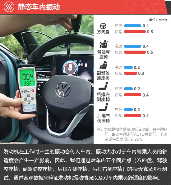 在静态车内振动测试环节,怠速状态下,2025款上汽大众帕萨特Pro方向盘和驾驶席座椅的振动数值保持一致,并且略高于其他部位。负载状态下,所有部位的振动数值均略有升高,其中后排座椅增幅较大,不过实际体感不太明显。