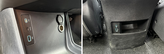 评测车前排配备1个USB Type-C接口和1个USB Type-A接口,均位于中控台下方;后排同样配备1个USB Type-C接口和1个USB Type-A接口,位于空调出风口下方,布局合理且兼容性不错。此外,前排中控台下方还提供1个12V电源接口,能够满足车内乘客多种电子设备的用电需求。