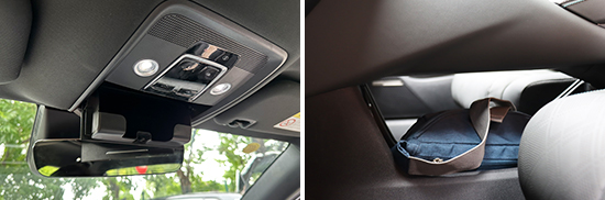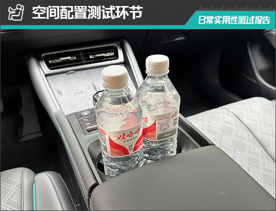 对于车内使用空间的测试,只针对前排触手可及的空间,不包括手套箱、中央扶手箱等需开启的空间。测试方法是将以下固定物品全部放置在前排的各个储物空间内,通过固定物品的放置情况来判断车辆储物空间的表现。测试选定的固定物品为:2瓶常规大小的矿泉水、1部大屏手机、1支口红、1个挎包、1副墨镜、1把折叠雨伞以及1包常规尺寸的抽纸。