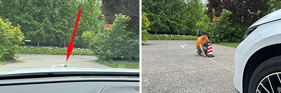 在测试前方视野环节,我们采用高70cm的桩桶作为参照物,随后调整车距,直至在主驾驶位可以看到桩桶上沿。经过测试,桩桶与车头最终测得的数据为2.5m,在测试过的同级别车型中处于中下游水平。