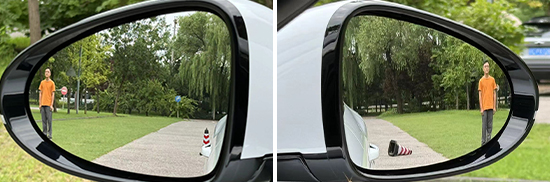 外后视镜视野范围测试时,首先让测试人员分别站在左右后视镜垂直10m处,随即开始向左右两侧移动,直至出现在两侧后视镜最外侧边缘为止,测出其横向距离。随后通过公式计算,便可以得出后视镜视野范围的夹角角度。角度越大则后视镜视野盲区范围越小,反之则后视镜视野盲区越大。