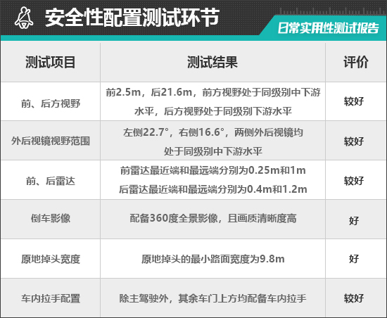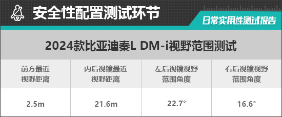 在车辆前、后方视野测试中,车内所有座椅均已调整至最低状态,所测出的数据与驾驶者正常使用时均有一些偏差,仅供参考。
