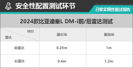 前驻车雷达最远可在1m处感应到前方物体,雷达功率表现出色。持续蜂鸣提示距离为0.25m,与测试经验值保持一致,便于驾驶者掌控前方距离。