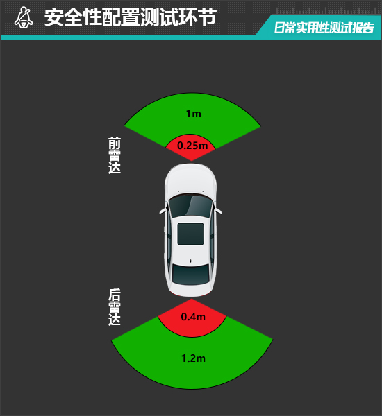 在测试过程中,倒车雷达在1.2m处可感应到后方物体,雷达功率表现较为出色。参考往期测试经验,持续蜂鸣阶段越接近0.25m则越贴近日常使用习惯。从实测数据来看,评测车的倒车雷达持续蜂鸣提示距离为0.4m,与测试经验值差距较大。