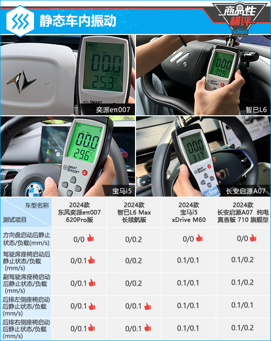 在静态车内振动测试中,在两种状态下,除智己L6之外,其他三款车型方向盘处的振动数值始终为0,表现可圈可点。相比之下,智己L6在负载状态下,驾驶席和副驾驶席座椅的振动数值有明显增加,但实际体感并不明显。