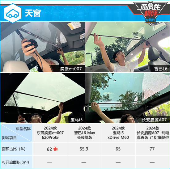 在针对天窗的测试中,四款车型均配备不可开启全景天窗。从数据层面来看,东风奕派eπ007面积占比最大,能够为车内乘客带来可观的通透感。