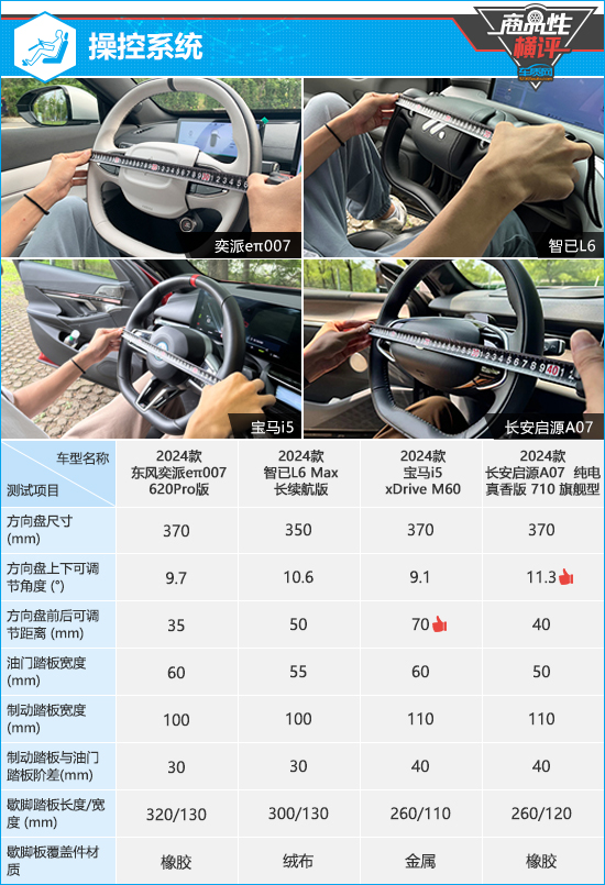 在操控系统方面,东风奕派eπ007、宝马i5和长安启源A07的方向盘尺寸适中,兼顾操控稳定性和灵活性,智己L6方向盘的直径偏小。调节方面,长安启源A07和宝马i5分别在上下可调角度和前后可调距离方面占据领先优势。