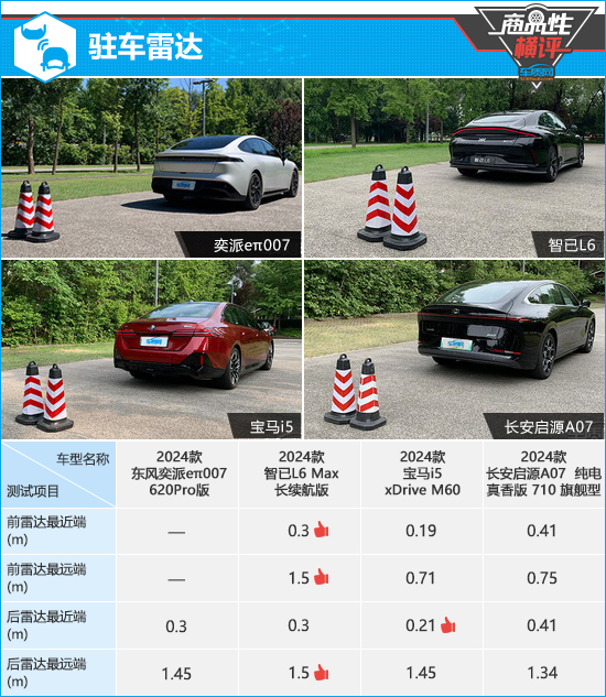 在雷达感应测试中,根据已有测试数据来看,四款车型表现各有不同。其中,智己L6后雷达探测能力较强,最远探测距离达到1.5m,雷达功率表现不错。参考往期测试经验,持续蜂鸣阶段越接近0.25m则越贴近日常使用习惯。从实测数据来看,宝马i5的后雷达持续蜂鸣提示距离与测试经验值比较接近。