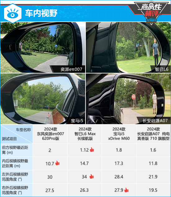 在外后视镜视野范围测试中,智己L6的左外后视镜视野范围更大,宝马i5则是右外后视镜视野范围表现出色。