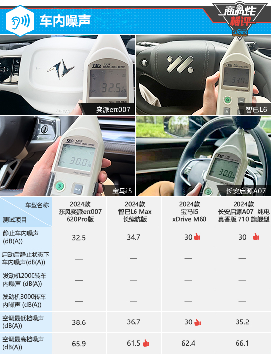 经实测,在静止状态下,长安启源A07和宝马i5的车内噪声达到了测试仪器的最低值30dB。由于四款车均采用纯电驱动,因此车辆在启动后静止状态下电动机传入车内的噪音可以忽略不计。