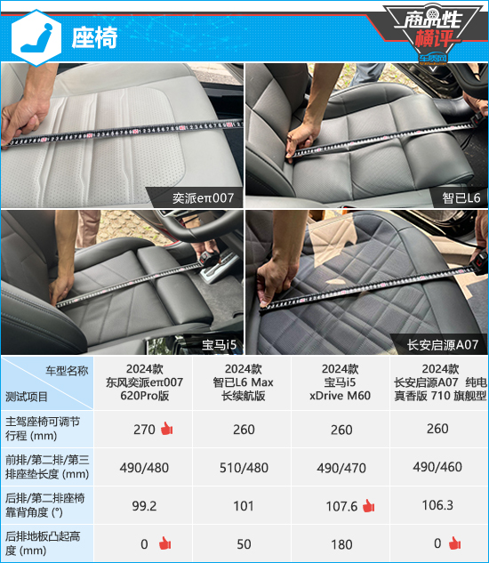 座垫长度方面,智己L6前排座椅座垫长度领先于其他三款车型,而长安启源A07后排座垫长度偏短,乘坐舒适性表现一般。后排座椅靠背角度方面,宝马i5表现不错,紧随其后的是长安启源A07,二者乘坐起来会更加舒适。