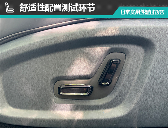 座椅方面,评测车前排座椅调节按键位于座椅侧面底部,调节按键位置合理。主/副驾驶座椅配备了3组座椅记忆,便利性不错。此外,前排座椅还支持3档加热、3档通风功能以及按摩功能,舒适性配置令人满意。