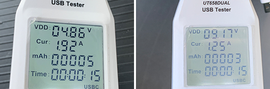 此外,我们对USB接口的电压与电流进行了测试。其中,前排USB Type-C接口的电压和电流分别为4.86V和1.92A。后排USB Type-C接口的电压和电流也分别9.17V和1.25A。