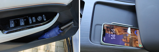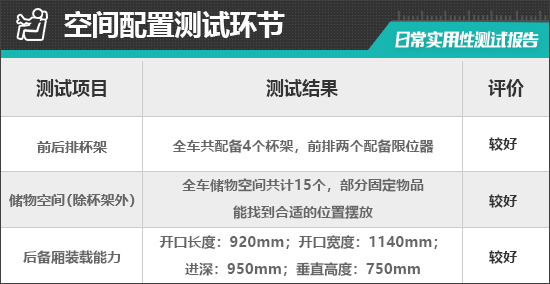 对于车内使用空间的测试,只针对前排触手可及的空间,不包括手套箱、中央扶手箱等需开启的空间。测试方法是将以下固定物品全部放置在前排的各个储物空间内,通过固定物品的放置情况来判断车辆储物空间的表现。测试选定的固定物品为:2瓶常规大小的矿泉水、1部大屏手机、1支口红、1个挎包、1副墨镜、1把折叠雨伞以及1包常规尺寸的抽纸。