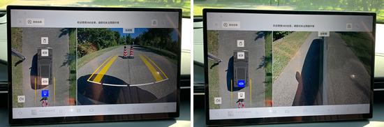 评测车配备了360度全景影像和透明底盘,方便驾驶员查看车辆周边情况。影像清晰度不错,车辆周围的畸变控制也比较合理,实用性不错。