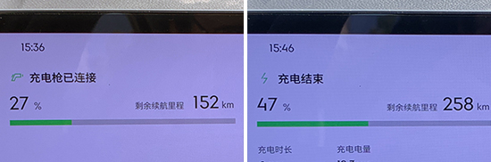 此外,对于充电效率我们也进行了测试。实测人员使用快充桩充电10分钟后(波峰用电),电量从27%充至47%,续航里程增加106km,与车辆电脑预计的用时基本吻合。