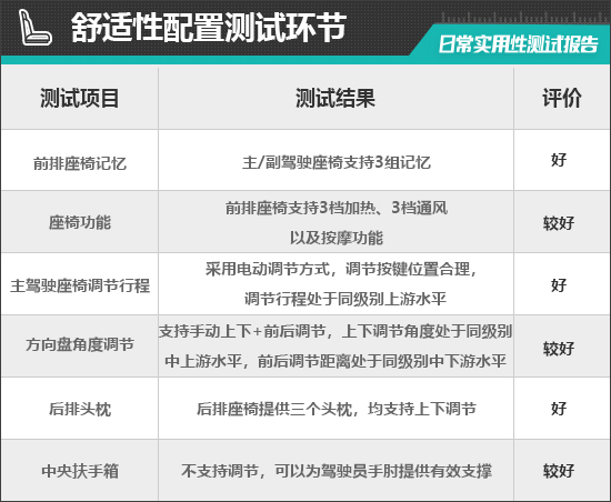 在主驾驶座椅测试中,评测车的驾驶座椅最前端和最末端之间的距离为270mm,处于同级别上游水平,座椅可调节行程非常可观。