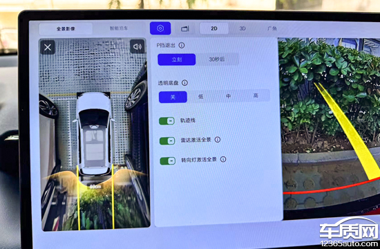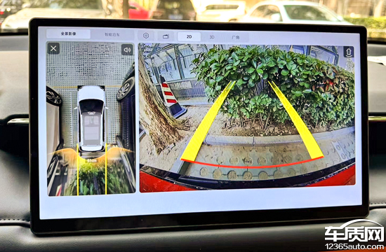 评测车配备了360°全景影像系统,支持透明底盘/540°影像以及多角度查看。实测在白天阳光充足的条件下,画面清晰度较高,镜头畸变情况也控制得当。此外,影像系统还提供了3D视角以及可随动的轨迹线等功能,实用性出色。
