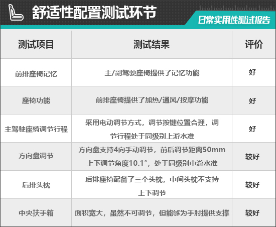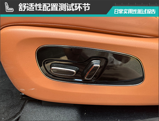 座椅方面,评测车前排座椅调节按键位于座垫侧面,调节按键位置合理,操作便捷。同时,评测车前排座椅提供了加热/通风/按摩功能,舒适性表现出众。