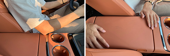 评测车前排中央扶手为侧开式设计,并采用皮质包裹,触摸手感比较不错。略有遗憾的是,该扶手不支持位置调节,但扶手前方进行了延长,在驾驶过程中还是能够对于驾驶者的手肘起到支撑作用。