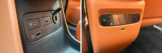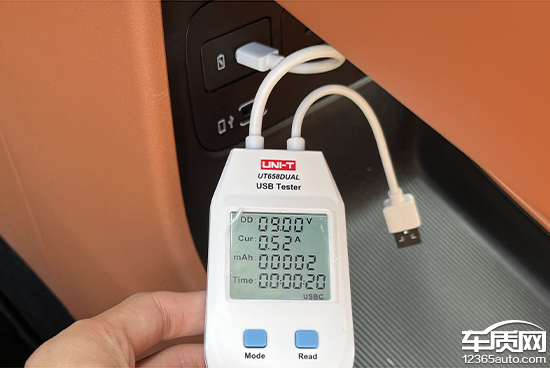 在车内USB接口方面,评测车前排配备了1个Type-A接口和1个Type-C接口,后排配备1个Type-A接口。与此同时,全车还配备了2个12V电源。此外,我们对USB接口的电压与电流进行了测试,其中前排USB Type-C接口的电压和电流分别达到9V和0.5A左右。