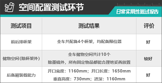 经过实测,评测车全车共计10个储物空间(不含杯架),上述固定物品除墨镜外,均具有合适的储物空间进行摆放,并且位置设计合理,拿取物品十分方便。