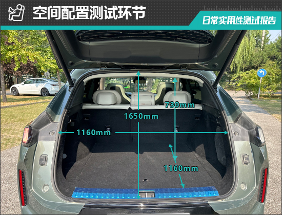 对于评测车后备厢的基础数值,我们也进行了实测,开口长度为1650mm;开口宽度为1160mm;后备厢进深为1160mm;后备厢地台与顶部的垂直高度为730mm。