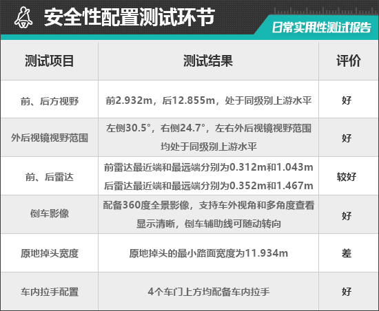 在车辆前、后方视野测试中,车内所有座椅均已调整至最低状态,所测出的数据与驾驶者正常使用时均有一些偏差,仅供参考。