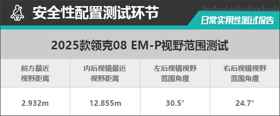 评测车左、右外后视镜均采用普通镜片。经实测,左、右外后视镜视野范围分别为30.5°和24.7°,处于同级别上游水平,两侧视野盲区均较小。