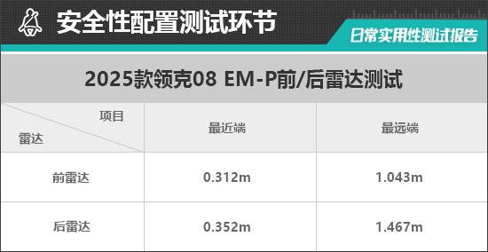 在测试过程中,倒车雷达在1.467m处可感应到后方物体,雷达功率表现出色。从实测数据来看,评测车的倒车雷达持续蜂鸣提示距离为0.352m。