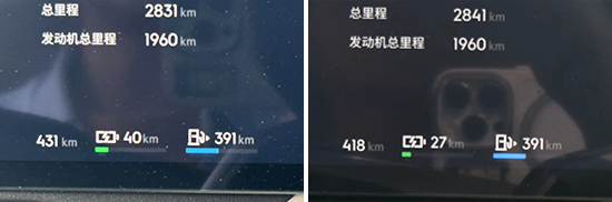 在实际测试中,将车内空调温度调至24℃,并开启纯电优先模式。行驶路线途经城市道路和环路,平均车速为50±2km/h。到达目的地时,车辆表显的公里数增加13km,续航里程减少13km,即平均每行驶1km消耗的续航里程约为1km。