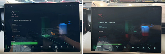 此外,对于充电效率我们也进行了测试。实测人员使用快充桩充电10分钟后(波峰用电),电量从4%充至18%,续航里程增加30km,与车辆电脑预计的用时基本吻合。