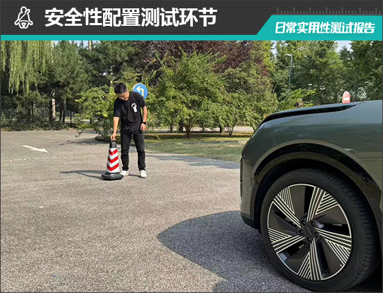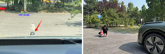 在测试前方视野环节,我们采用高70cm的桩桶作为参照物,随后调整车距,直至在主驾驶位可以看到桩桶上沿。经过测试,桩桶与车头最终测得的数据为2.932m,在测试过的同级别车型中处于上游水平。