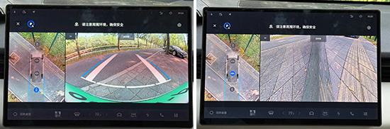 评测车配备了360度全景影像,整体画质清晰度不错。同时,影像画面显示清晰,镜头畸变情况较小,并且还提供了可随动的辅助线,表现出色。