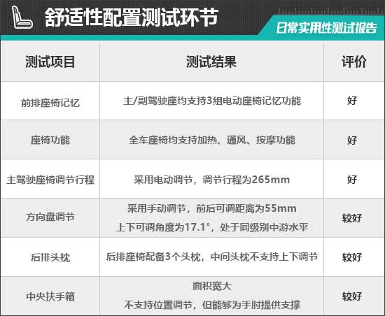 在主驾驶座椅测试中,评测车的驾驶座椅最前端和最末端之间的距离为265mm,处于同级别上游水平。
