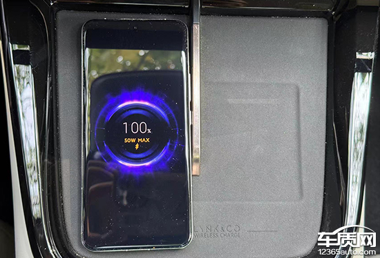 评测车在前排杯架的前方配备了1个50W的手机无线充电板,位置比较合理,拿取较为便捷。值得一提的是,无线充电板还配有散热口,散热效果较好。