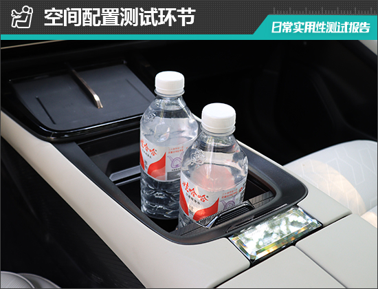 对于车内使用空间的测试,只针对前排触手可及的空间,不包括手套箱、中央扶手箱等需开启的空间。测试方法是将以下固定物品全部放置在前排的各个储物空间内,通过固定物品的放置情况来判断车辆储物空间的表现。测试选定的固定物品为:2瓶常规大小的矿泉水、1部大屏手机、1支口红、1个挎包、1副墨镜、1把折叠雨伞以及1包常规尺寸的抽纸。