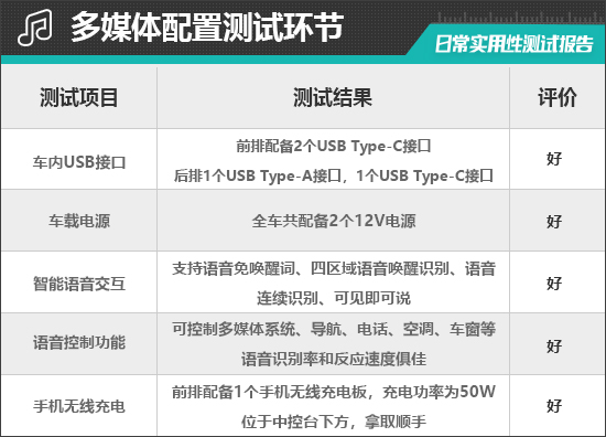 经过实测,评测车的智能语音系统能够全部识别上述指令,并且语音识别准确,反应速度较快。此外,评测车还支持语音免唤醒词、四区域语音唤醒识别、语音连续识别、可见即可说等功能。