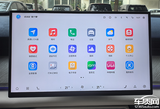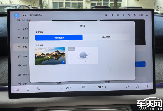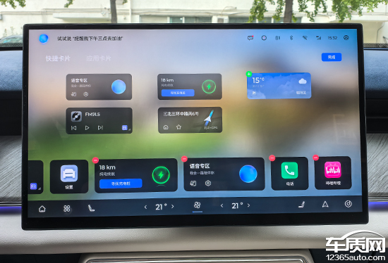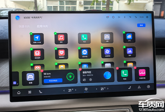 中控屏桌面可以通过左右滑动来进行快速更换,图片质量都很高,不太容易出现审美疲劳。屏幕底部配有虚拟卡片,分为快捷卡片和应用卡片,长按图标即可进入设置界面,方便用户根据使用习惯进行DIY。这部分设计十分巧妙,充分利用了屏幕尺寸,功能展示清晰,交互感受相当出色。此外,点击屏幕空白处还能隐藏卡片,以便让屏幕显示纯净的图片桌面,显得更加清爽简洁。